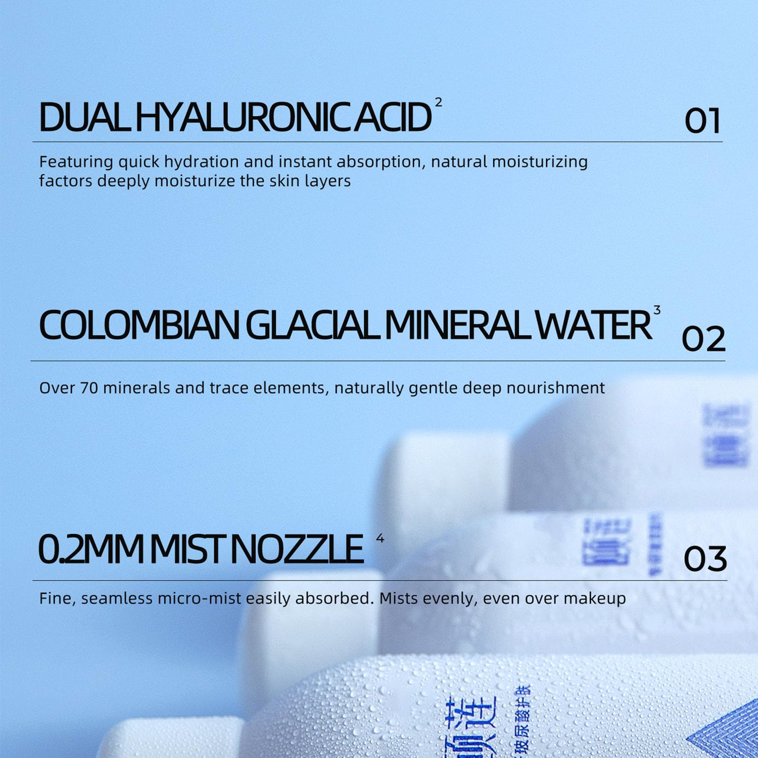 This hydrating face mist features sodium hyaluronate (hyaluronic acid) and Columbia glacier mineral water, rich in over 70 beneficial minerals and trace elements. This facial mist spray hydration formula deeply hydrates without drying the skin.