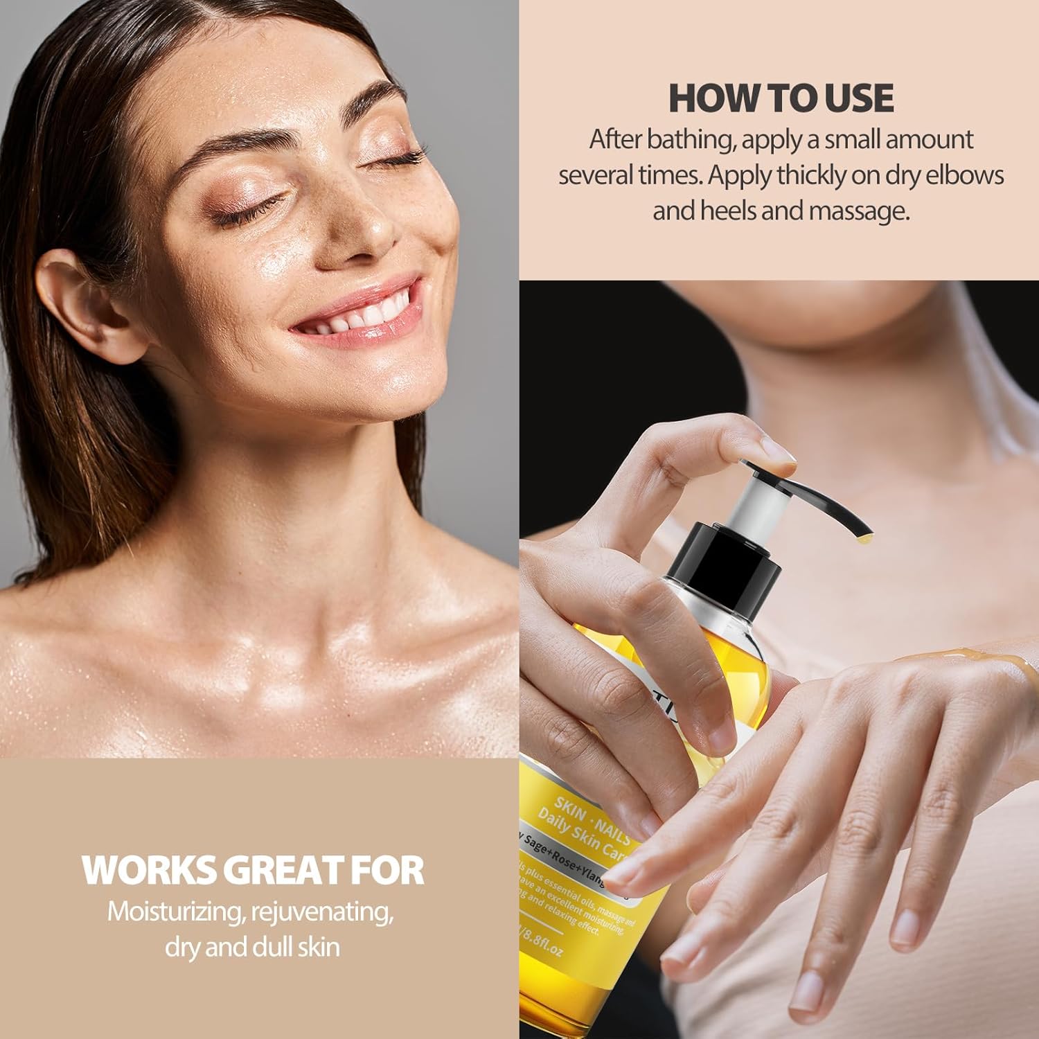 【Featured Thoughtful Design】Every bottle of body oil is bottled in 260ML large bottle, this super value bulk size is great for meeting all your skincare needs.It also comes with a pump dispenser with clip lock lets you get the exact amount you drop, so you can enjoy the most out of every drop of body oil.